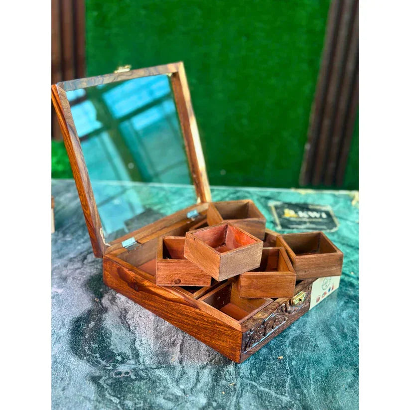 Apni kitchen ko dein traditional aur elegant touch iss beautiful Sheesham Wood Spice Box ke sath. 9 spacious compartments aur non-breakable glass lid ke sath yeh masala box har ghar ke liye perfect choice hai.