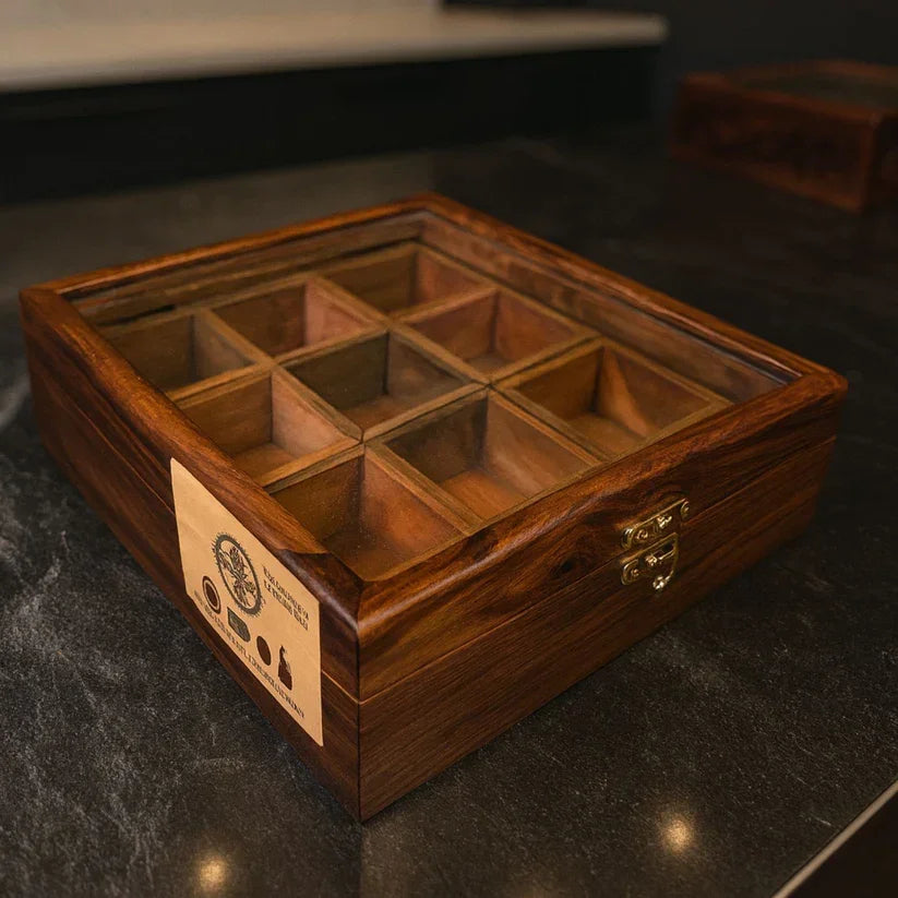 Premium Sheesham Wooden Spice Box – 9 Compartments Masala Dani with Glass Lid