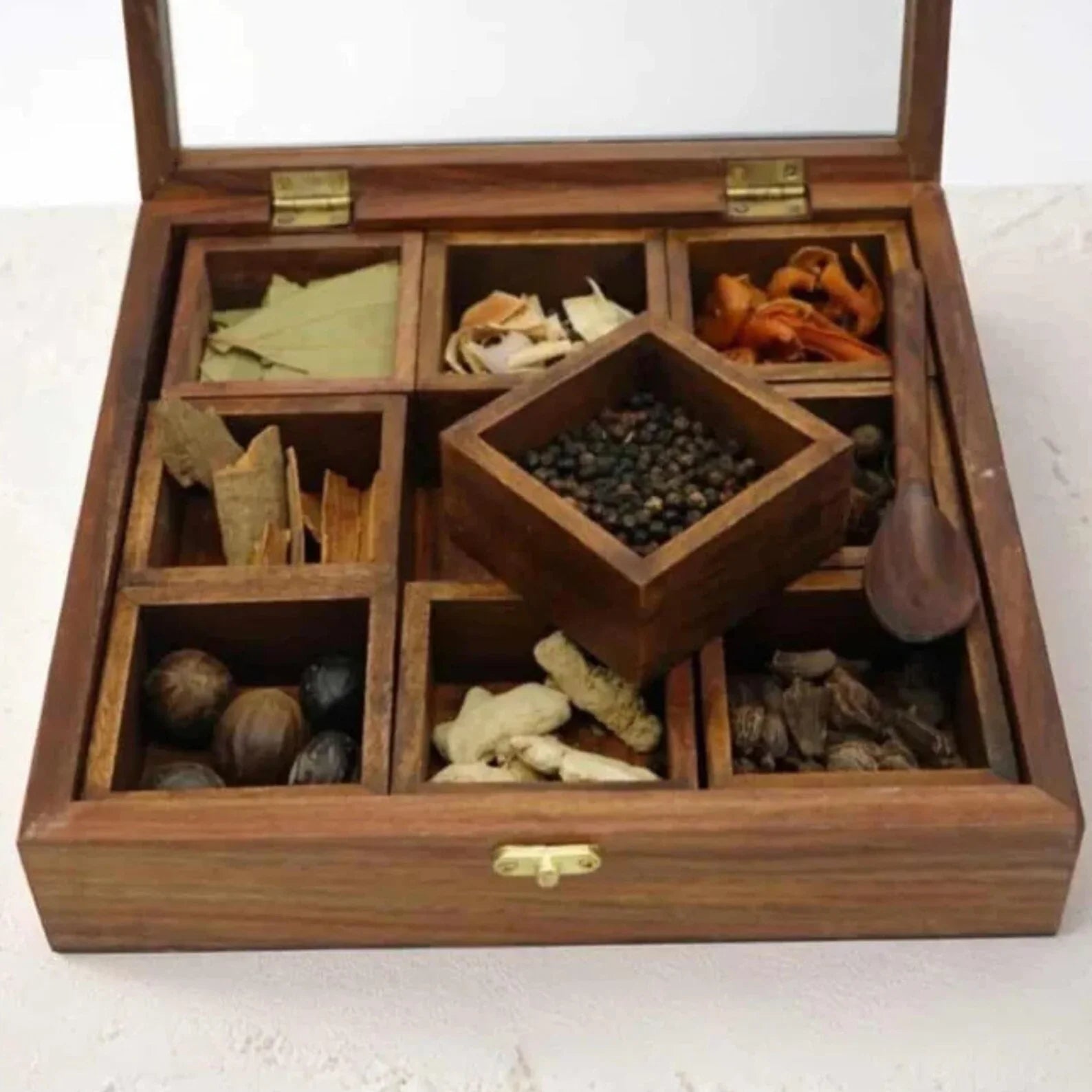 Iska sturdy wooden build isay long-term use ke liye perfect banata hai. Glass lid ki wajah se aap easily dekh sakte hain ke kaunsa masala kahan rakha hai — bina box kholay.
